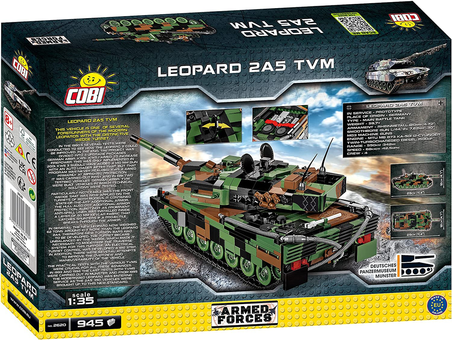 The Leopard 2 A5 is a German basic tank prototype. This new model from COBI is faithfully reproduced from 945 COBI building blocks and realistically reflects the look of its museum counterpart. Moving elements such as the tank's turret and barrel, rotating wheels and tracks as well as completely new, opening hatches allow all military fans to enjoy the model. The engine of the tank has also been opened, which can be viewed by opening the service hatch. Every adult enthusiast of history and armored weapons will surely be happy to add this model to his collection.