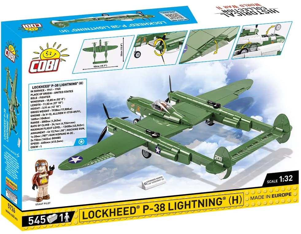The P-38 LIGHTNING is released under the original license of the American defense company Lockheed Martin. Accurately reproduced in a 1:32 scale model, the plane consists of 545 COBI construction blocks. The model is covered with high-quality prints that do not wear off even during intense play. It is worth noting the characteristic markings and emblems refer to a historical aircraft bearing the number 208 and nose art of Pluto the dog. The plane has rotating propellers, folding landing gear, movable ailerons and an opening cabin in which you can place the well-designed pilot figure. The whole set is completed with a brick with the printed name of the set and the Lockheed Martin logo!