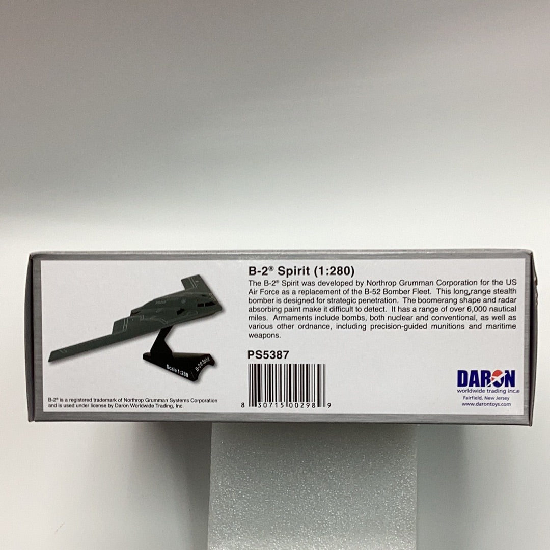 The B-2 Spirit was developed by the Air Force as a replacement for the aging B-52 bomber fleet. This long range stealth bomber is designed for strategic penetration. The boomerang shape and radar absorbing paint make it difficult to detect radar. It has a range of over 6,000 nautical miles. Armaments include bombs, both nuclear and conventional, as well as rotary launchers. It is the most expensive military aircraft ever produced with an approximate unit cost of $2.4 Billion. This die-cast metal model comes in 1:280 scale with plastic stand and is approximately 3 inches long with 7 3/8 inch wingspan.
